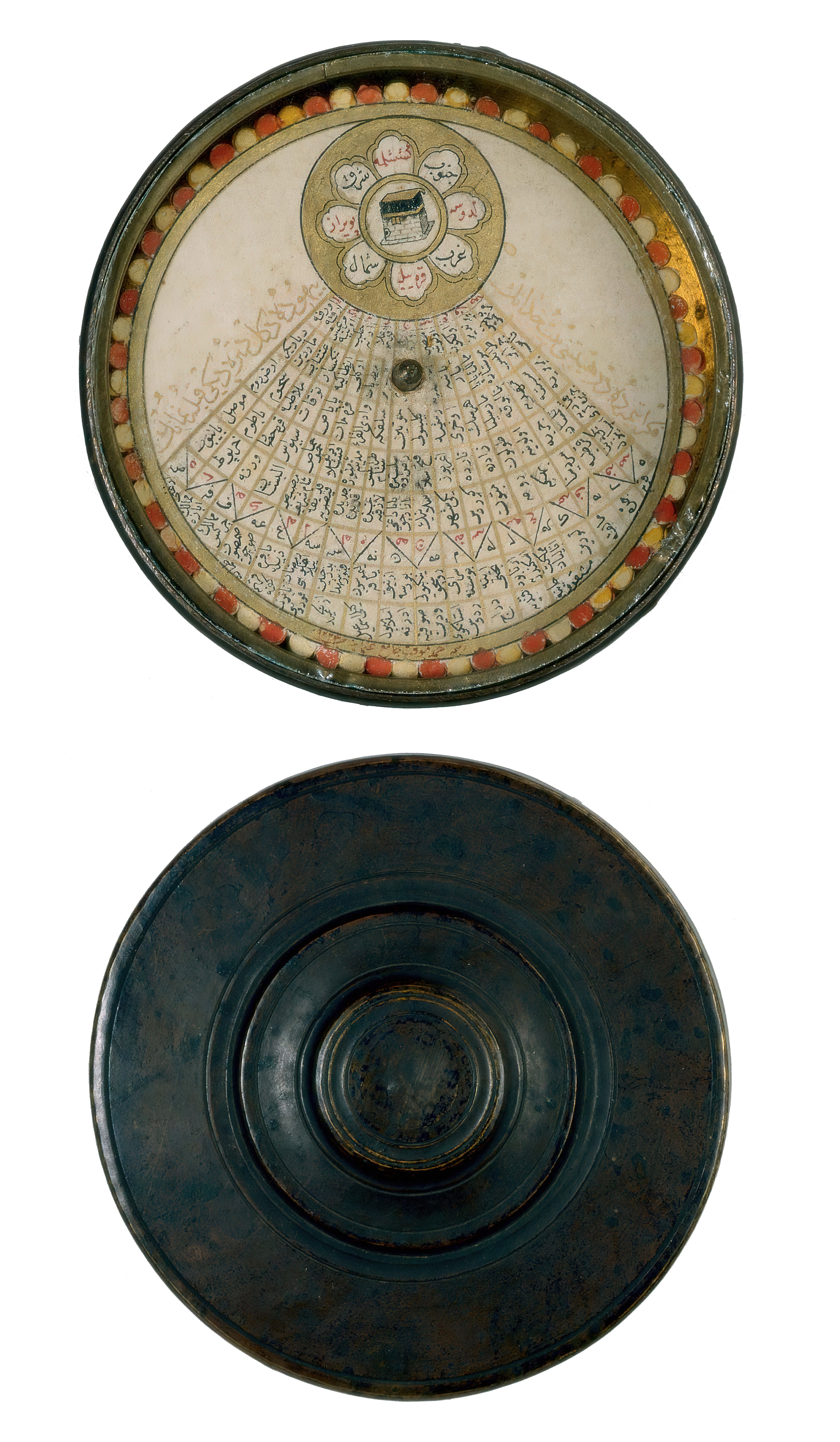 A depiction of the Ka‘bah lies near the circumference of the circular card, or fly, and is surrounded by a gold disc containing eight cartouches. Within these the four cardinal points are marked in black, and four intermediary points, which were given the names of the relevant winds, are in red. From the Ka‘bah disc radiates a fan-shaped table inscribed with the names of places ranging from the Ottoman cities of Urfa, Diyarbakır, Erzurum and Mosul in the east to Fez, Barbary, the Canary Islands and Cartagena (Spain) in the west. The whole disc is edged with a gold band and a frill of petals, with the signature of the maker opposite the Ka‘bah. He was an astronomer named Ahmad, who was timekeeper (muwaqqit) of the Osmaniye, that is, the Nuruosmaniye, mosque in Istanbul, completed in 1755 by the Ottoman Sultan Osman III.