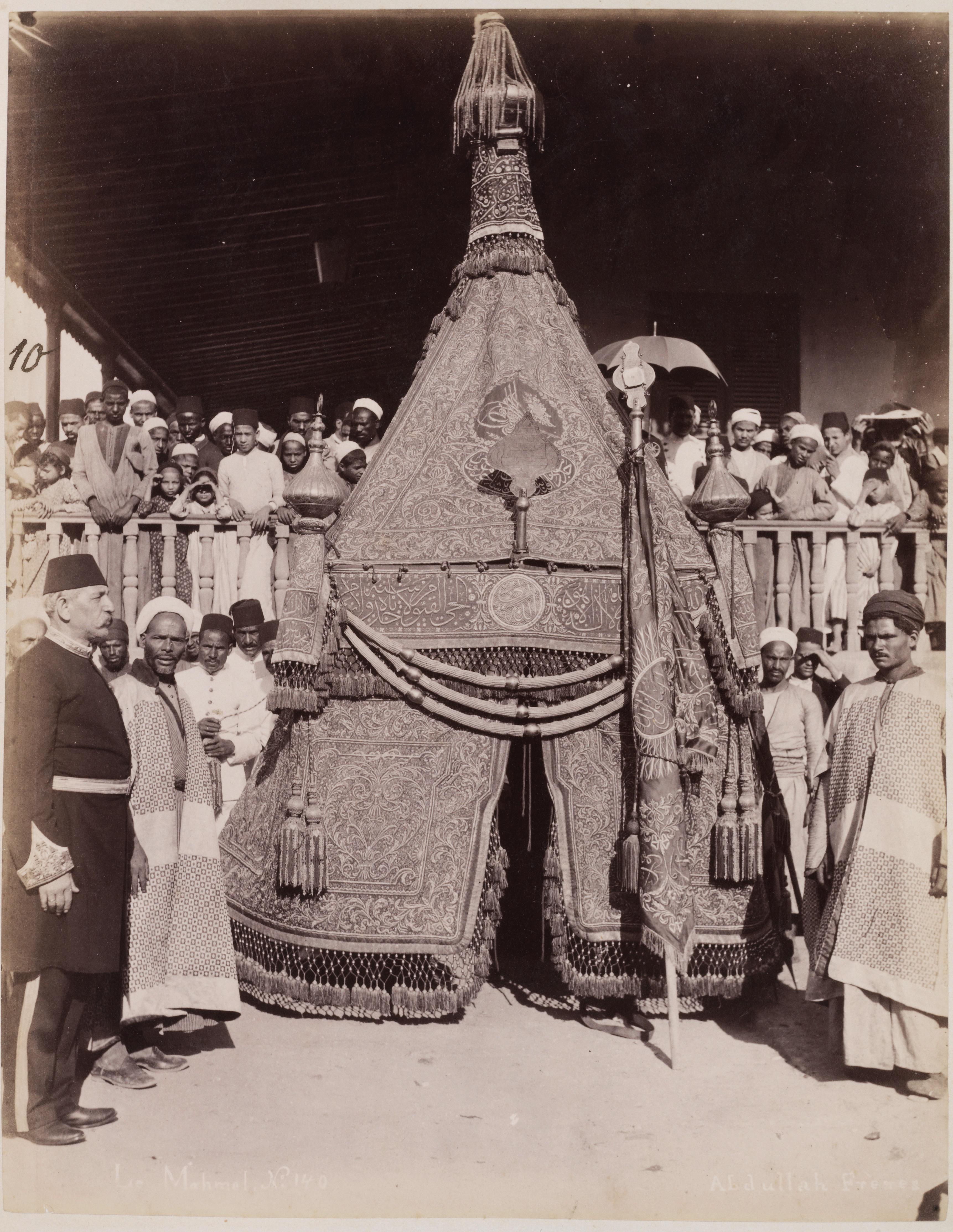 This photograph shows the Mahmal preparing to leave Cairo for Mecca. It is has the title: 'Le Mahmal no 140' with the signature of Abdullah Frères. Abdullah Frères were three Ottoman Armenian brothers who ran photographic studios in Istanbul, Cairo and Izmir. In 1862 they were named official royal photographers to the Ottoman court with the entitlement to use the royal monogram. Their studio operated between 1858-99 and while they were appointed to photograph Sultan Abdülaziz and Sultan Abdülhamid II, they were also commissioned to document aspects of the Ottoman Empire. This image was also reproduced on postcards and was also used in Saleh Soubhy’s Pèlerinage à la Mecque et à Médine. Visible on the mahmal is the date 1304 (AH), with part of the name of the Khedive Muhammd Tawfiq, meaning that the Mahmal was sent by order of Sultan ‘Abdulhamid II.