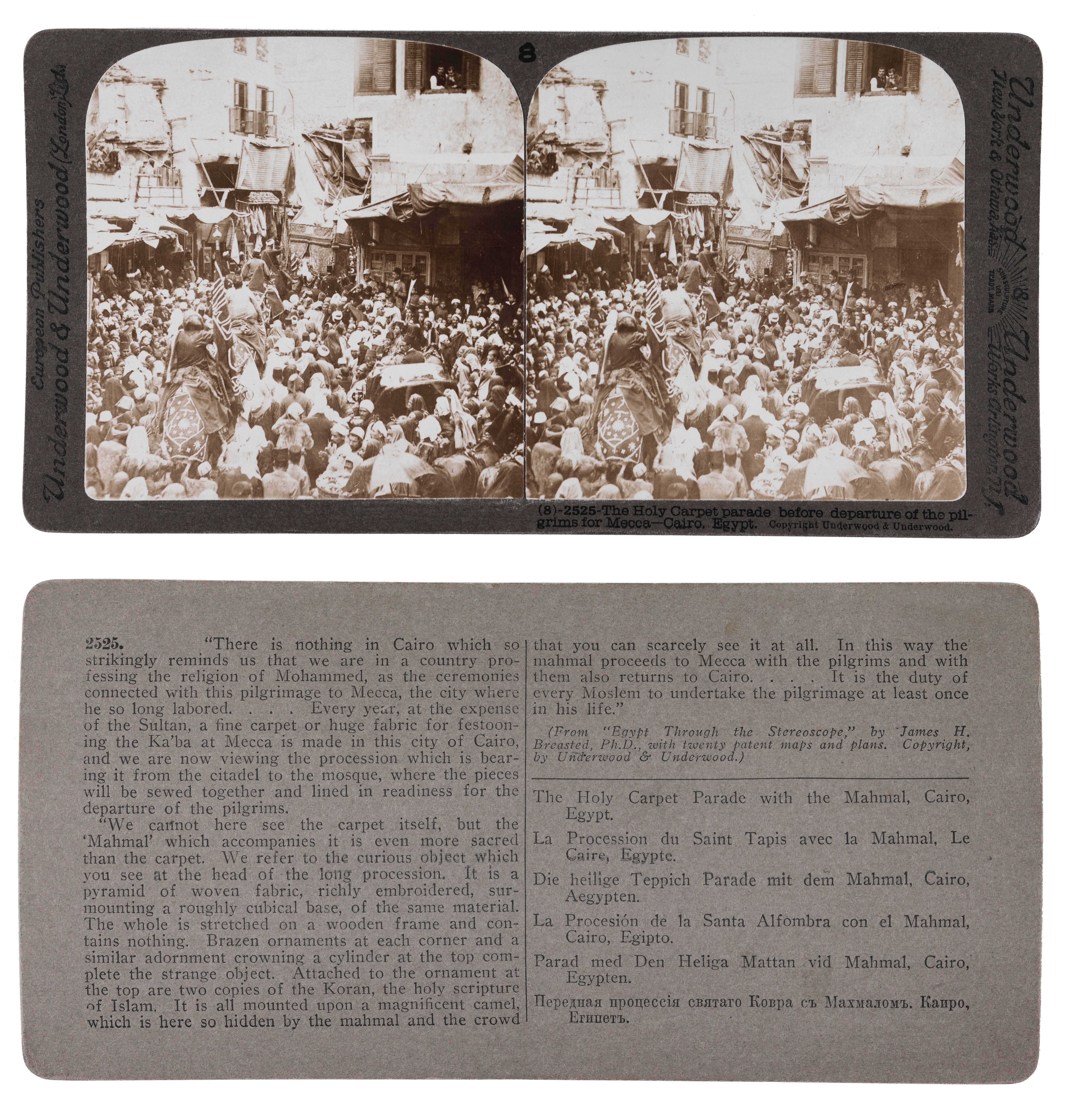 Published by Underwood & Underwood (London) Ltd. and with excerpts from ‘Egypt through the Stereoscope’ by James H. Breasted, PhD., this stereoview shows the Mahmal procession in Cairo.