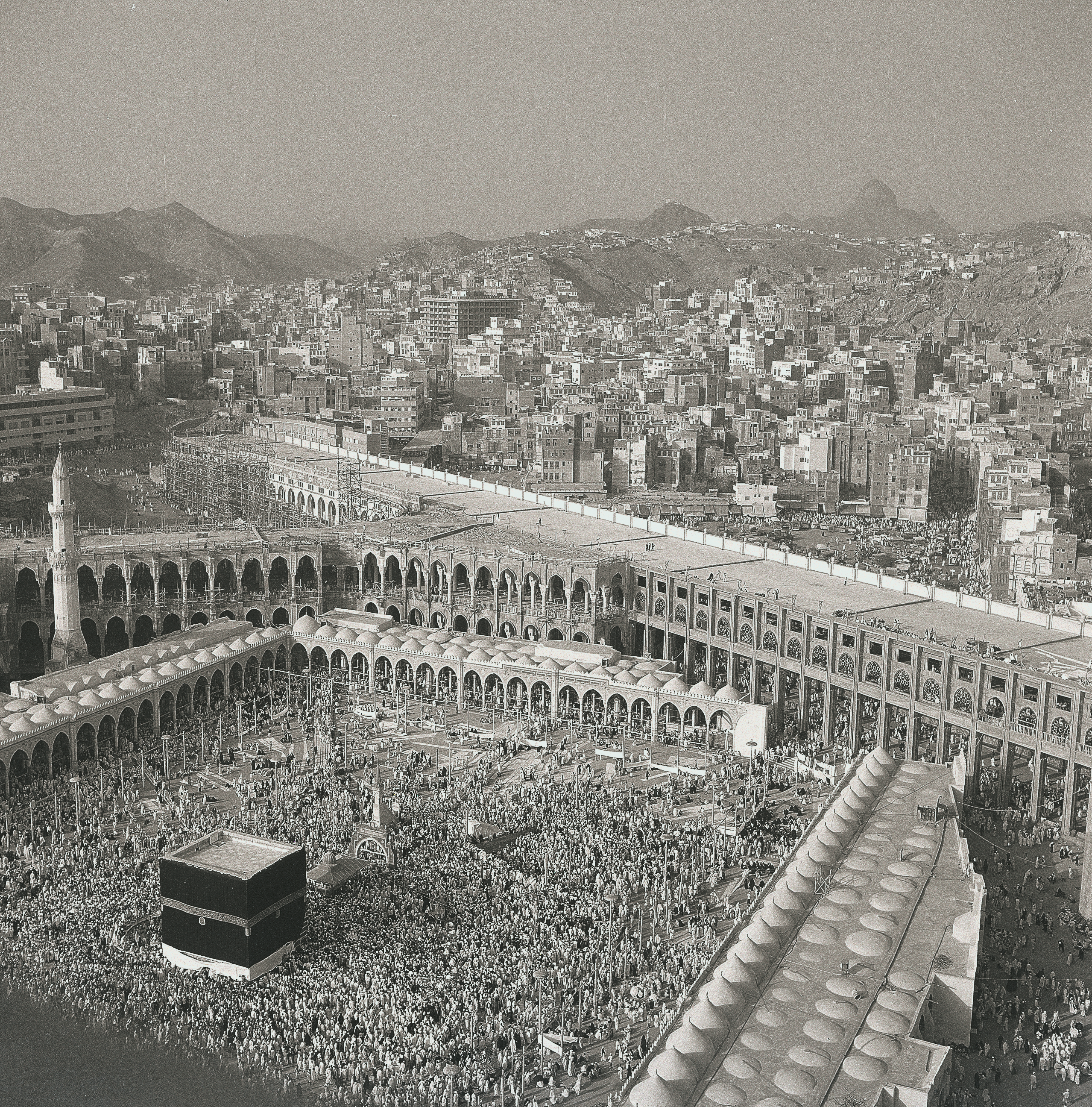 Safouh Izzat Naamani was born in Beirut in 1926 and very early on became fascinated by photography. He first travelled to Saudi Arabia in 1951 in order to photograph political events and in 1954 travelled to Mecca specifically to photograph the Masjid al-Haram and the Hajj. Naamani was one of the first photographers to capture Hajj from the air and his aerial photographs of Hajj and Mecca are unique in this period. His photographs from the 1960s capture the newly expanding sanctuary. This photograph was taken during the second phase of the Saudi extension, during the reign of King Faisal (r. 1964–1975). The photograph clearly shows the newly covered Safa-Marwa area for sa‘y in construction; also visible is the imposing Jabal al-Nur to the right of the skyline.