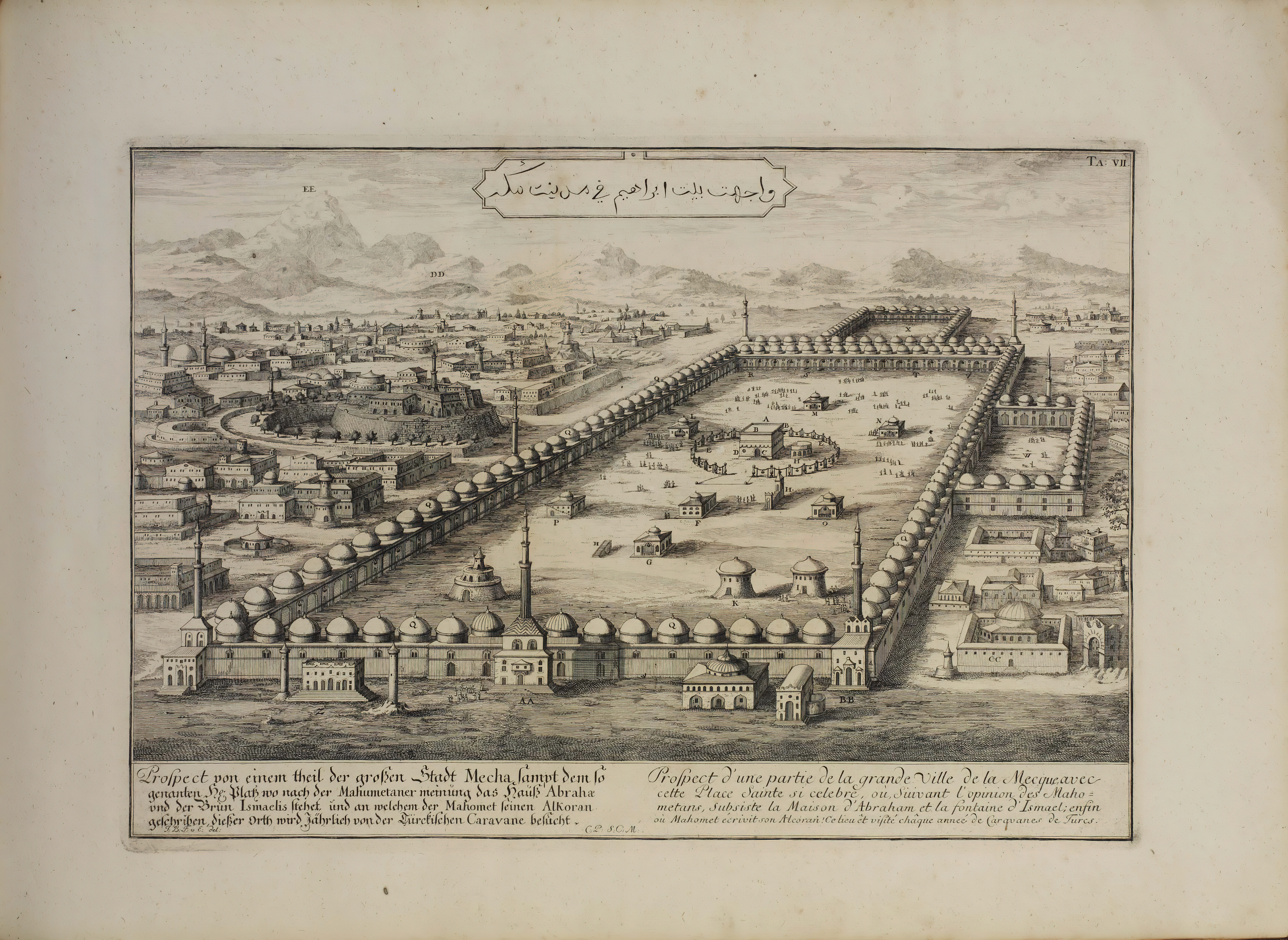 The book is considered one of the first to attempt an architectural history of the world. It includes nine Islamic buildings amongst its listing of thirteen ‘foreign’ buildings. The line drawings of the Iranian and Ottoman buildings are known to have been sourced from illustrated travellers’ accounts, but the addition of the View of Medina and the View of Mecca are remarkable for their originality. Underneath each picture is engraved explanatory text in German and French and they may be the first representations of Mecca and Medina in a European work.