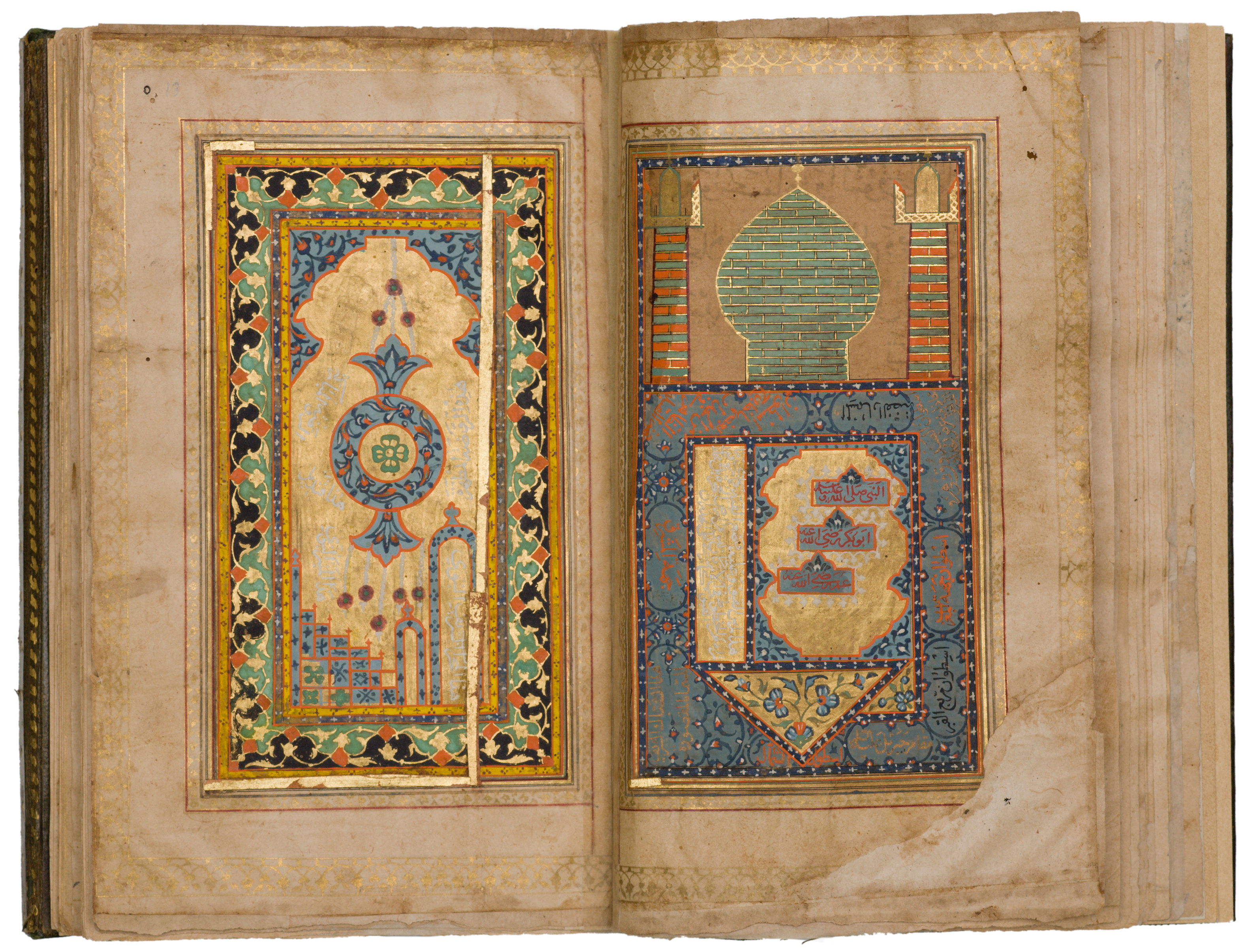 The tomb of the Prophet and his two companions Abu Bakr and ‘Umar al-Khattab, who are buried in the same chamber, are depicted here and clearly labelled. All are shown located beneath the characteristic green dome of Medina. The left hand page depicts the Prophet’s mihrab and the minbar.