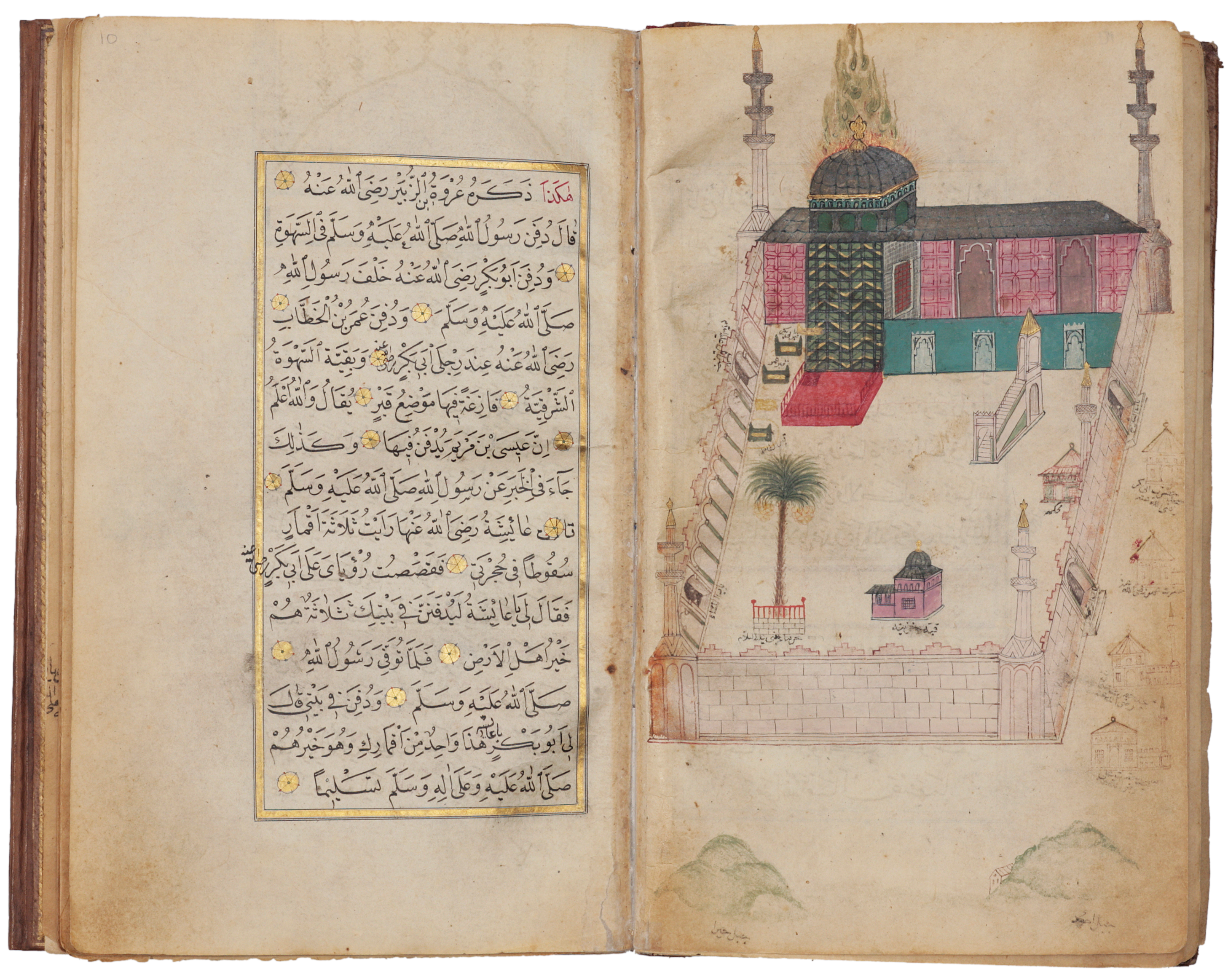 Many Ottoman copies show the Masjid al-Haram at Mecca and the Mosque of the Prophet at Medina, although there is no reference to them in the text. This copy, however, only shows the mosque at Medina, with the domed tomb of the Prophet under a fiery nimbus, as well as other monuments inside and outside the sacred enclosure.