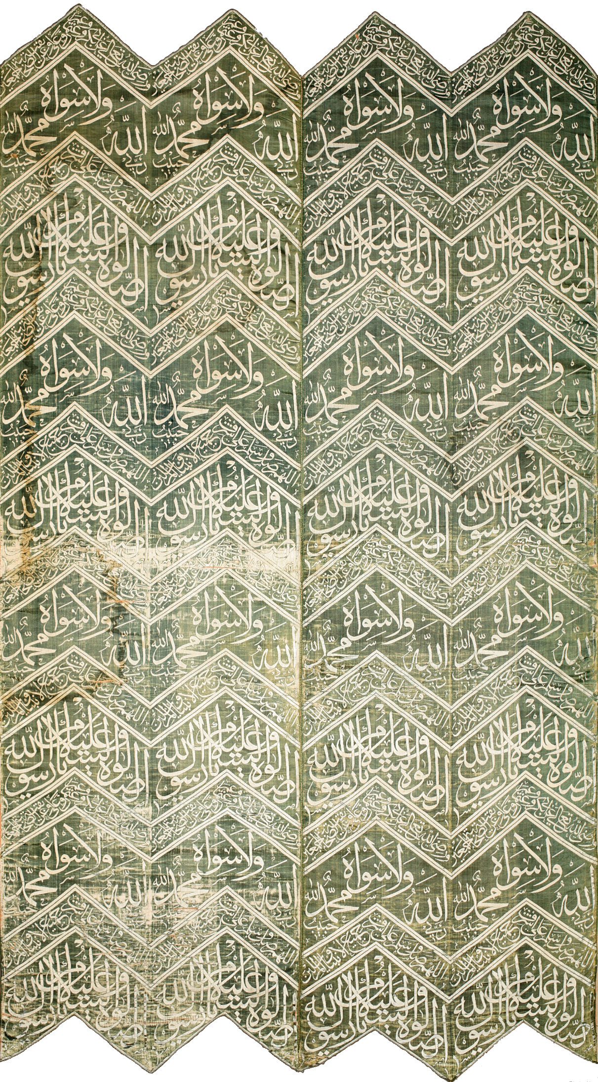 The repeating inscriptions in the narrow bands consist of prayers for the four Orthodox caliphs and the Companions of the Prophet, as well as all prophets and messengers. Alternate wider bands read, ‘God, my Lord, there is none but He, Muhammad the beloved of my Lord’ and ‘Prayers and Peace be upon you, O messenger of God’.