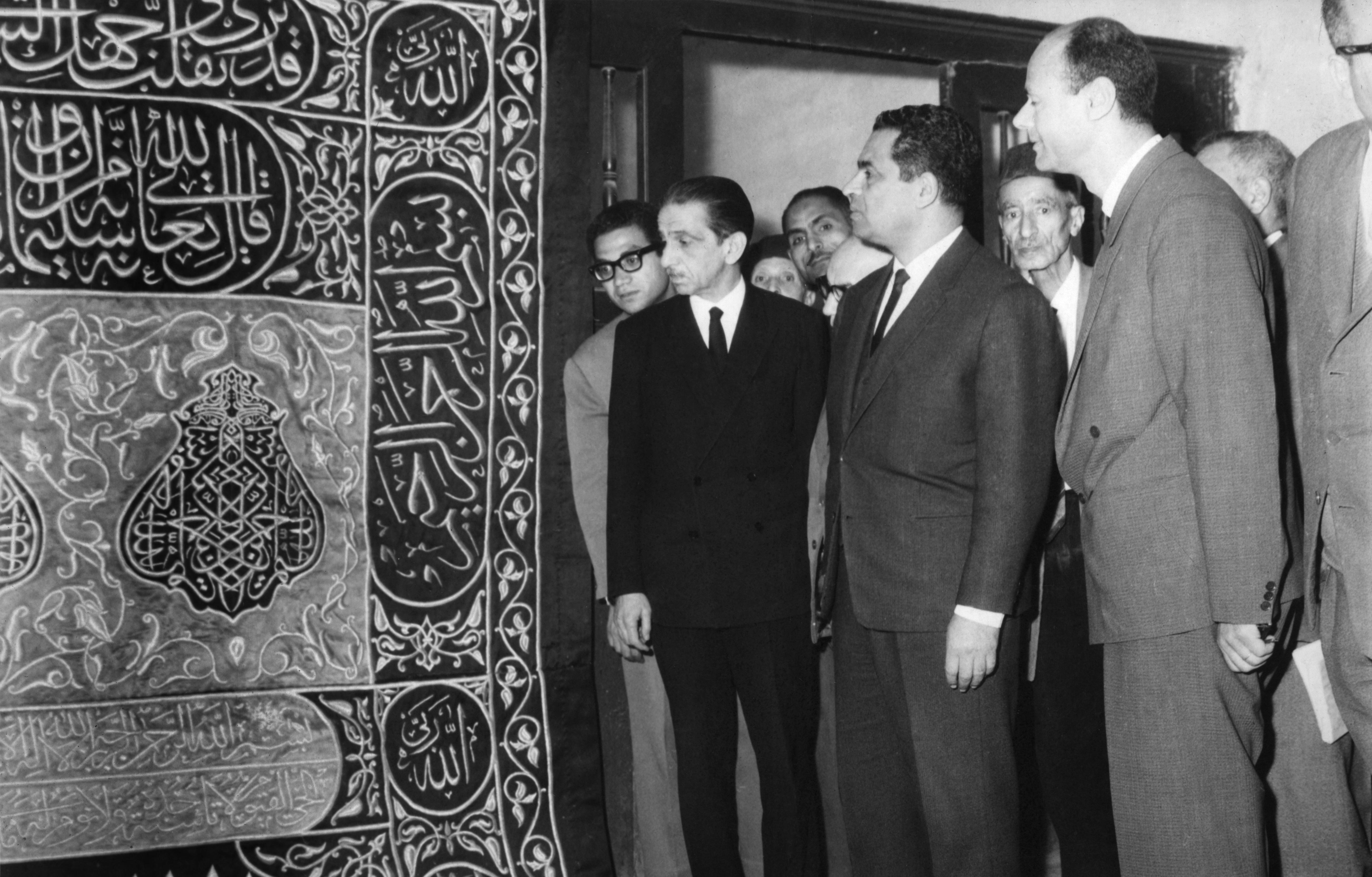 Visit of the Minister of Religious Endowments, Dr ‘Abd al-‘Aziz Kamil, to Dar al-Kiswah on 6.02.1969, inspecting the sitarah of the door of the Ka‘bah. From an album of 29 photographic prints of the Dar al-Kiswah.
