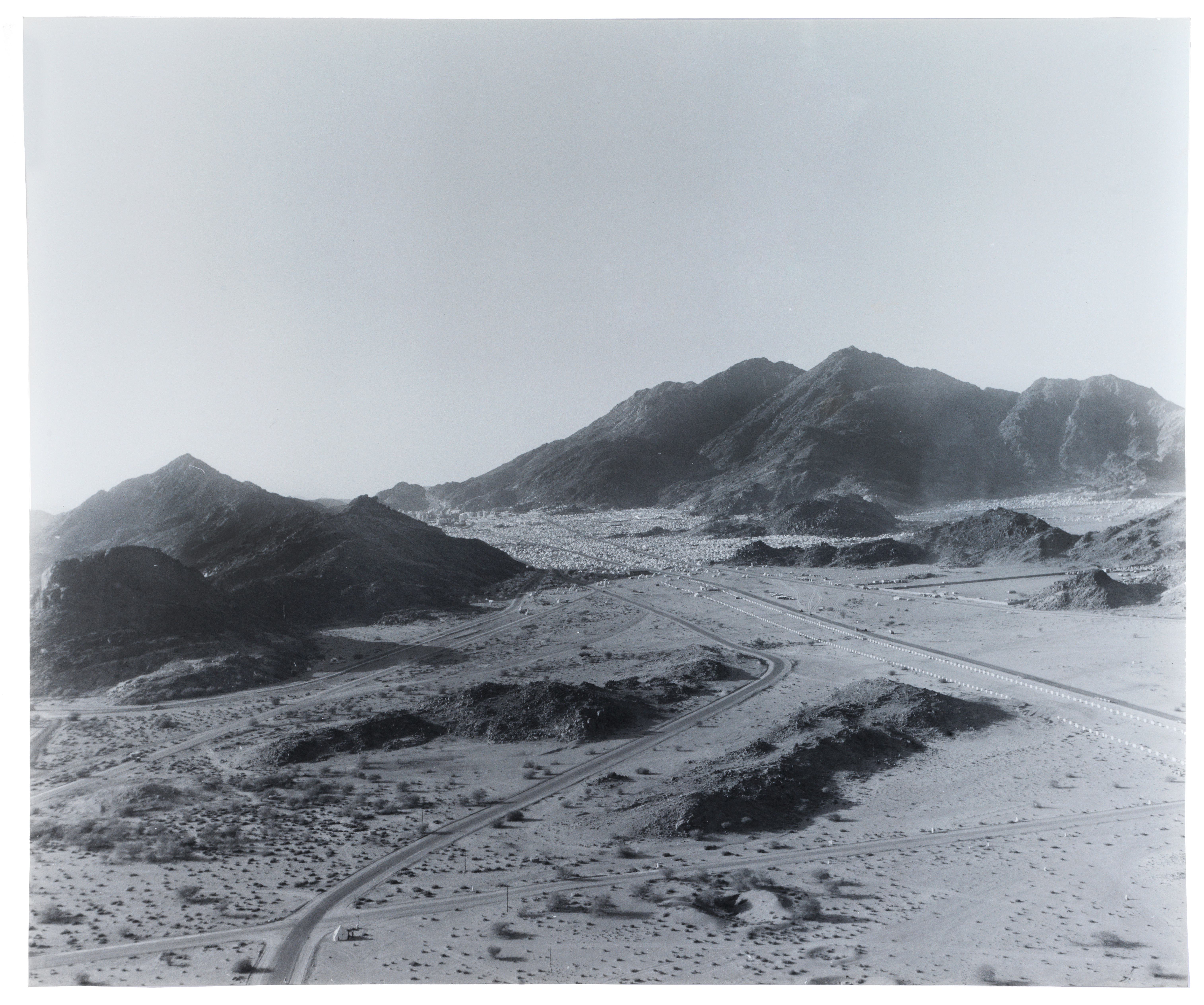 Safouh Izzat Naamani was born in Beirut in 1926 and very early on became fascinated by photography. He first travelled to Saudi Arabia in 1951 in order to photograph political events and in 1954 travelled to Mecca specifically to photograph the Masjid al-Haram and the Hajj. Naamani was one of the first photographers to capture Hajj from the air and his aerial photographs of Hajj and Mecca are unique in this period. His photographs from the 1960s capture the newly expanding sanctuary. This photograph covers the area of Muzdalifah facing northwest towards Mina.