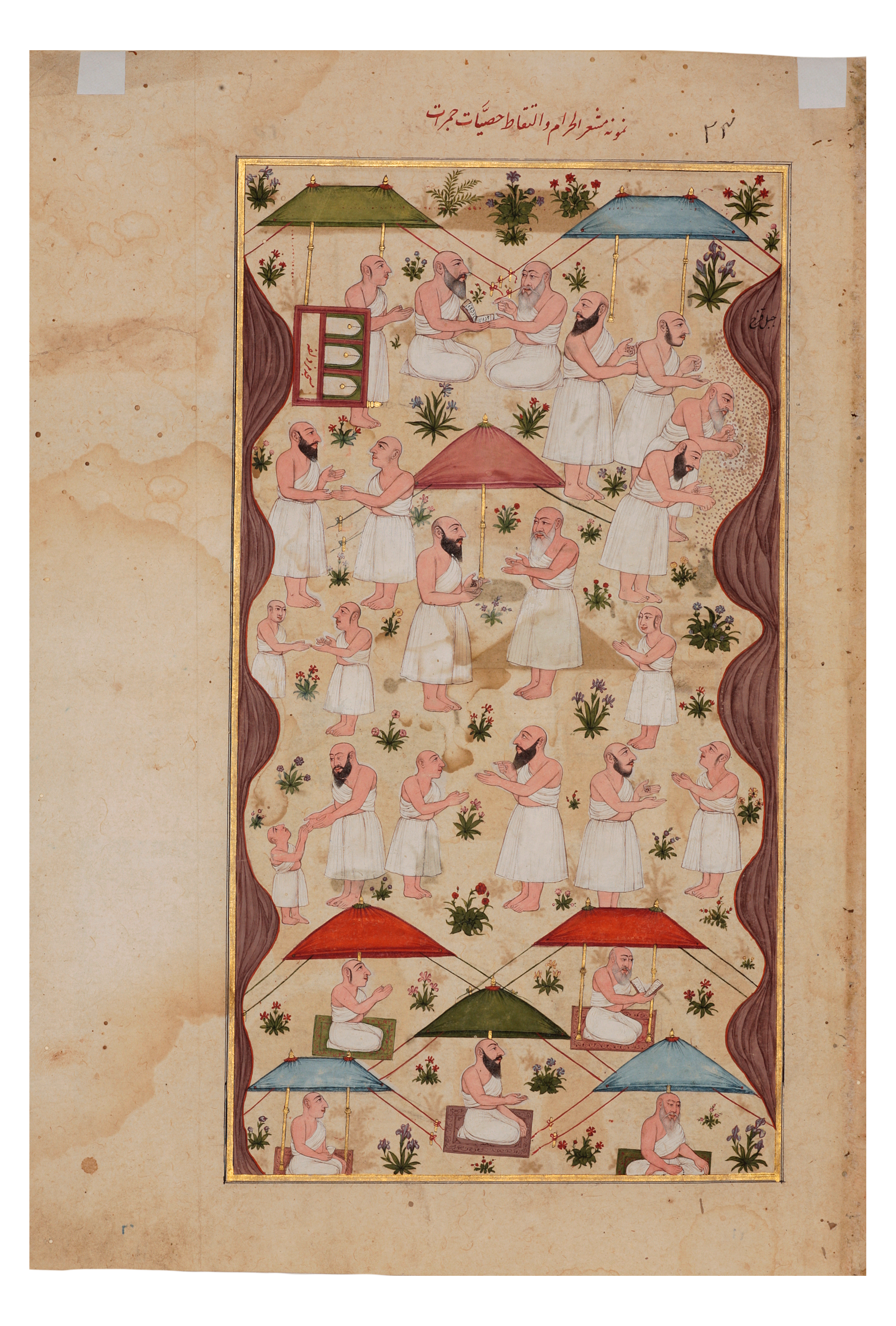 The manuscript differs from other guides to the Holy Places in that its illustrations include vivid scenes of pilgrims performing the various rites and cogent pictures of their camp life. Illustrated here is the scene at Muzdalifa, with the pilgrims in the state of ihram, collecting pebbles. The pebbles are used in the rituals at Mina, when they must cast the pebbles at three pillars, called the Jamarat, which symbolise the devil.