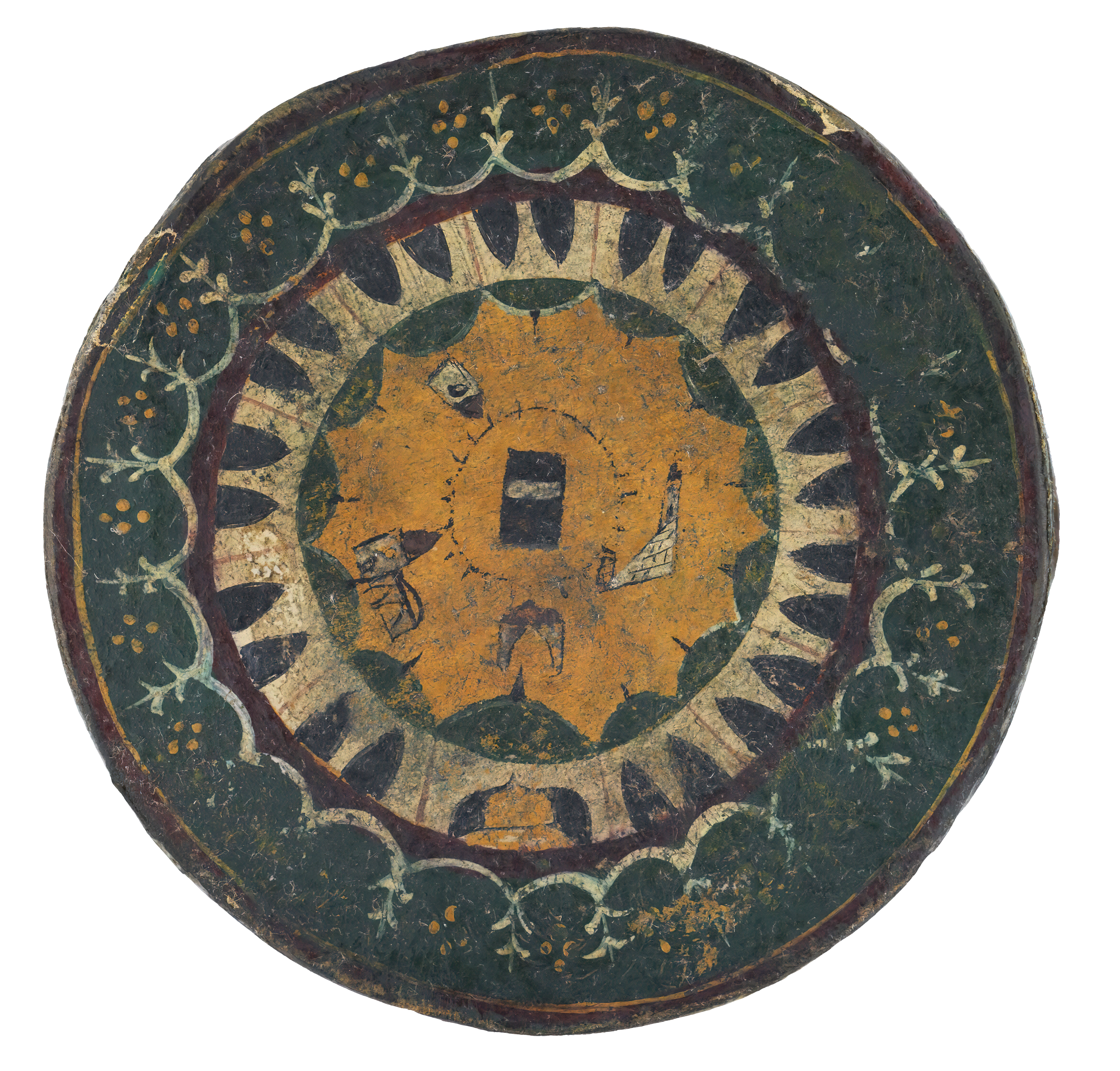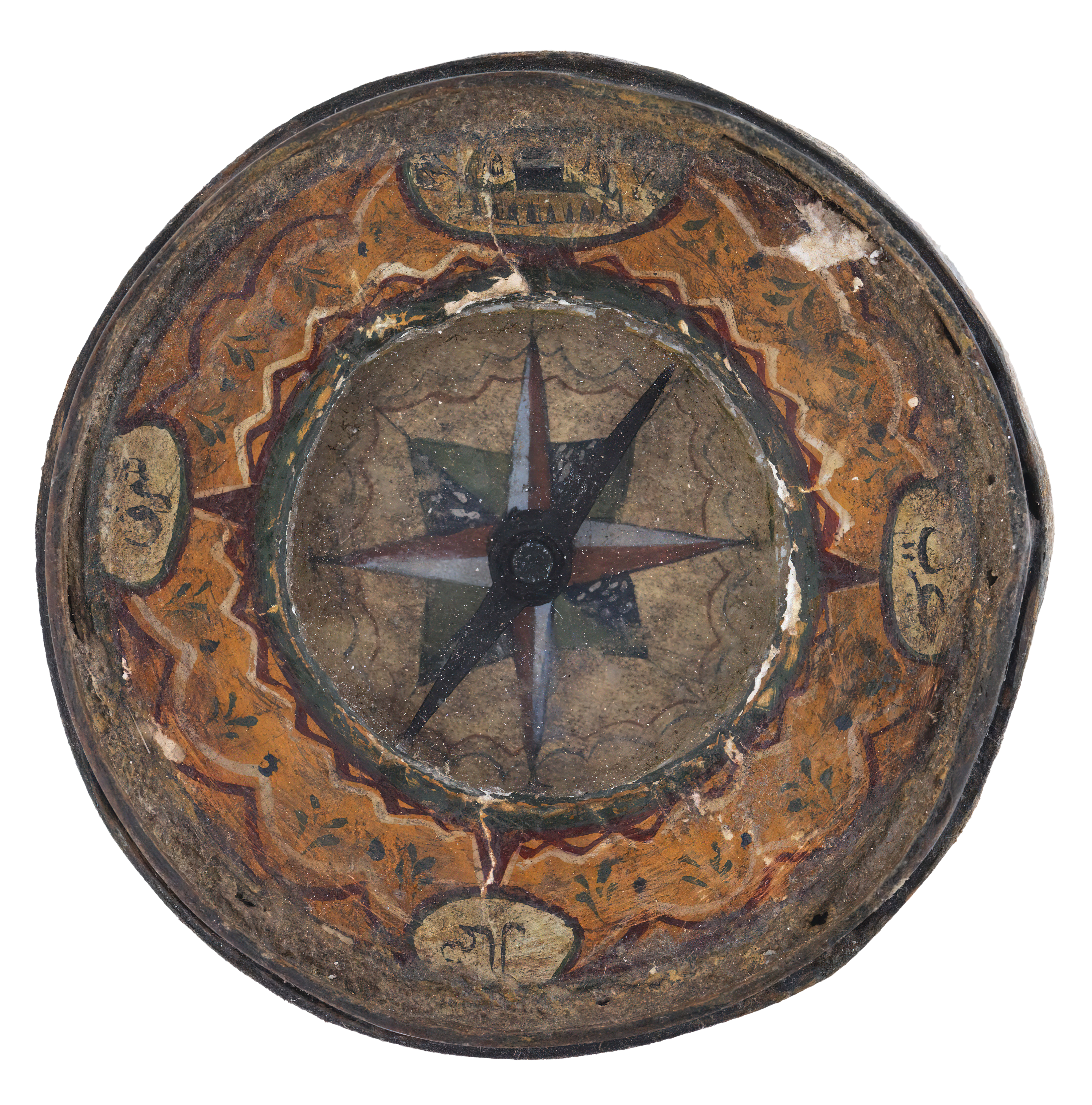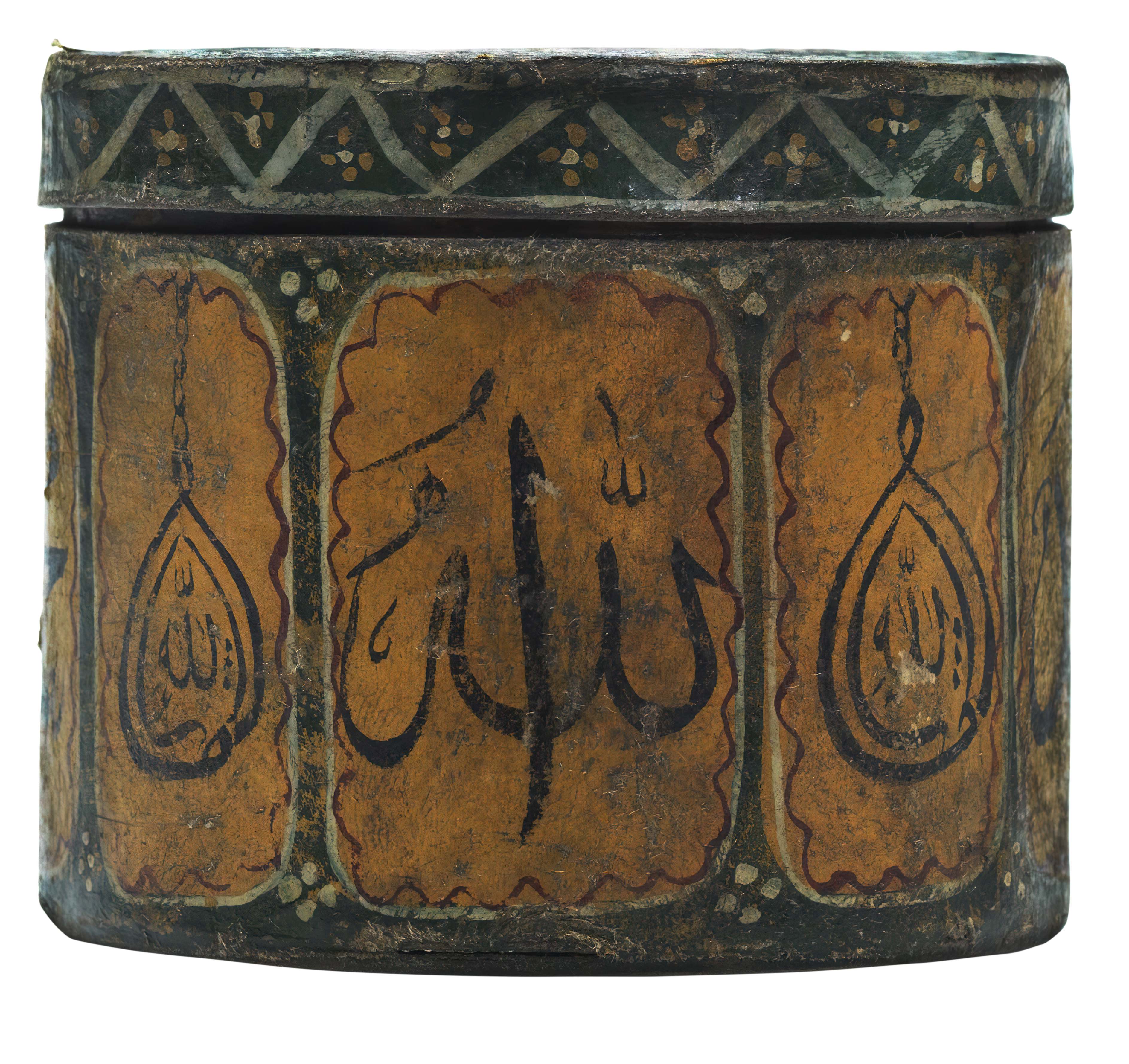 The schematic depictions around the Ka‘bah on the top of the lid include Zamzam and the minbar of the Haram. A view of the Meccan sanctuary replaces the word junub (‘south’) on the interior. The names of Allah and Muhammad alternate with the phrase Masha’a Allah (‘Whatsoever God wills’) on the sides.