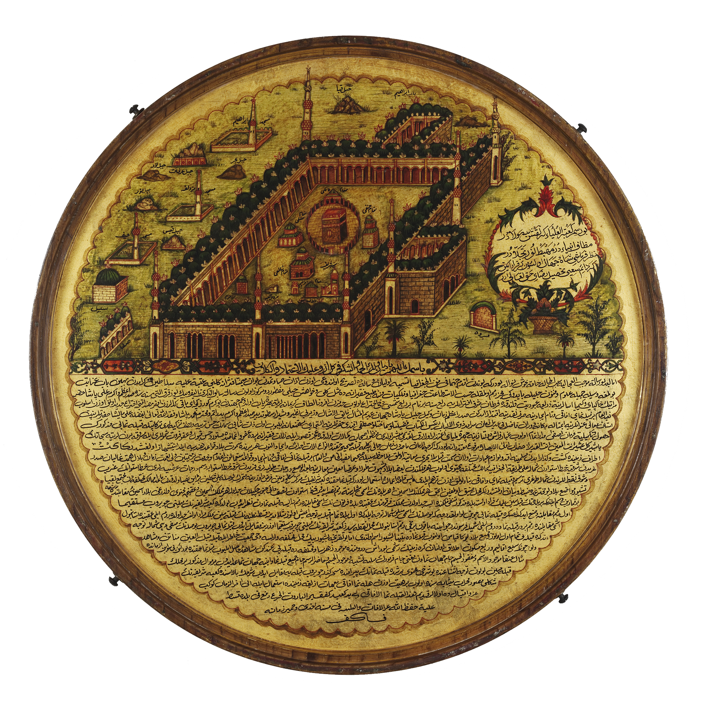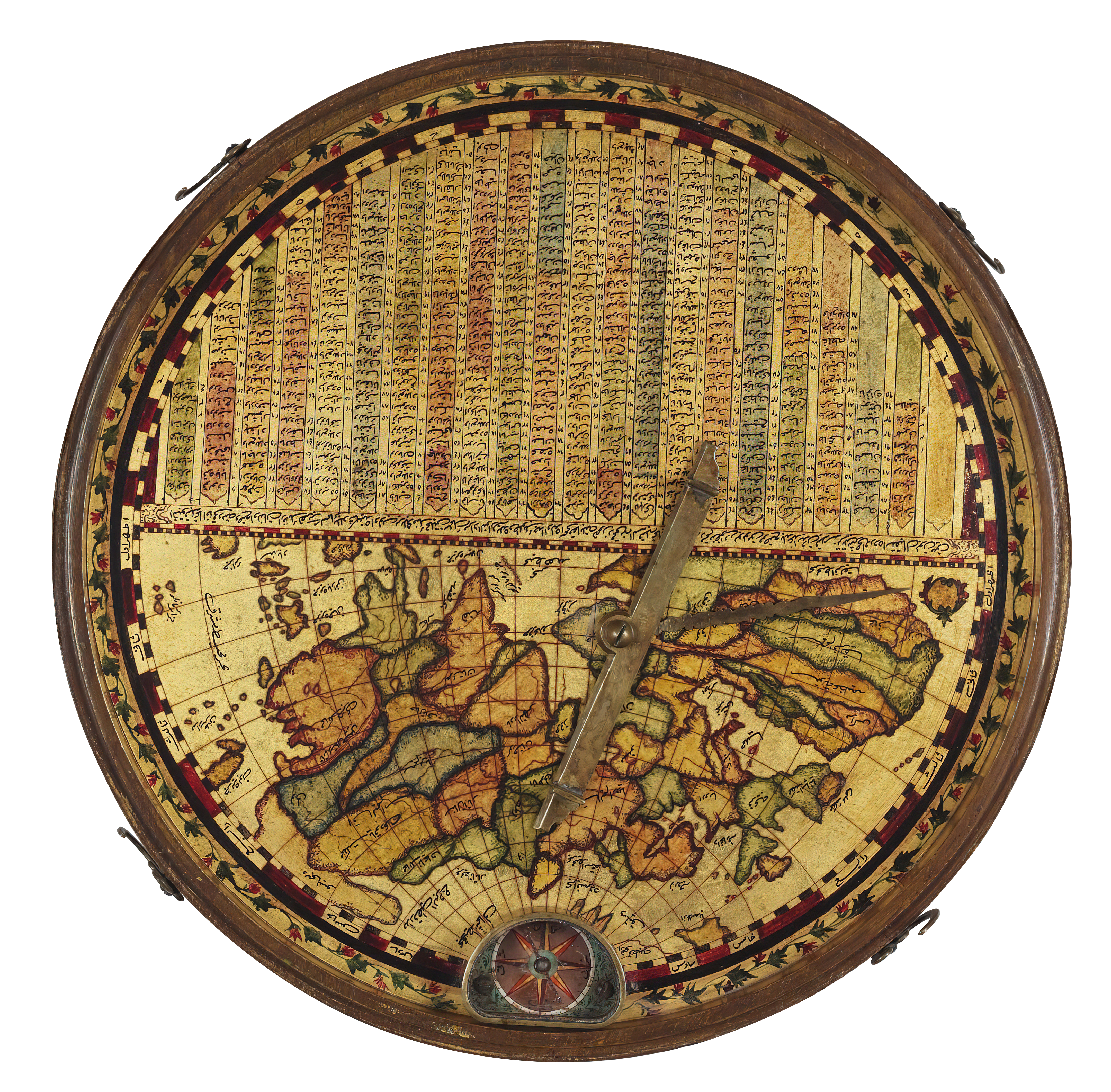 Qiblah compass in lacquer-painted wooden box and lid, interior with view of Mecca on Legacy-collections Sphere from
