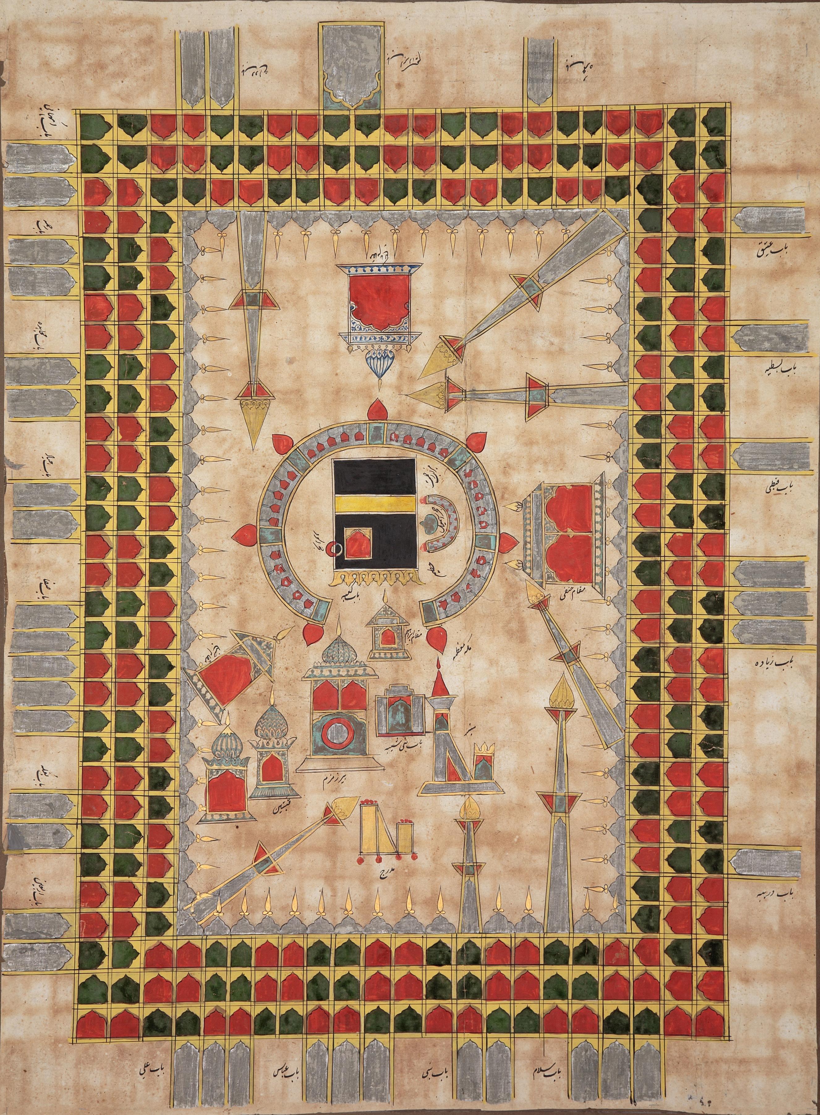 Examples of hajj certificates – issued as attestations that pilgrims have completed the prescribed rites or that the rites have been completed on their behalf – are known from the 12th century on, although complete early specimens are rare. Their proliferation in later centuries may partly be explained by the increase in proxy pilgrimages. In addition to views of the main stations of pilgrimage in Mecca and its environs, the certificates included a view of the Mosque of the Prophet in Medina. The diagrammatic style of the depictions, which combine elevations with ground-plan views, changed little over the centuries and the same stylistic conventions can be seen in illustrations to literary works on the holy sanctuaries, such as theDala’il al-khayrat. The style of the domes seen on many of the structures suggests that they were painted by Indian artists who were perhaps working in Mecca.