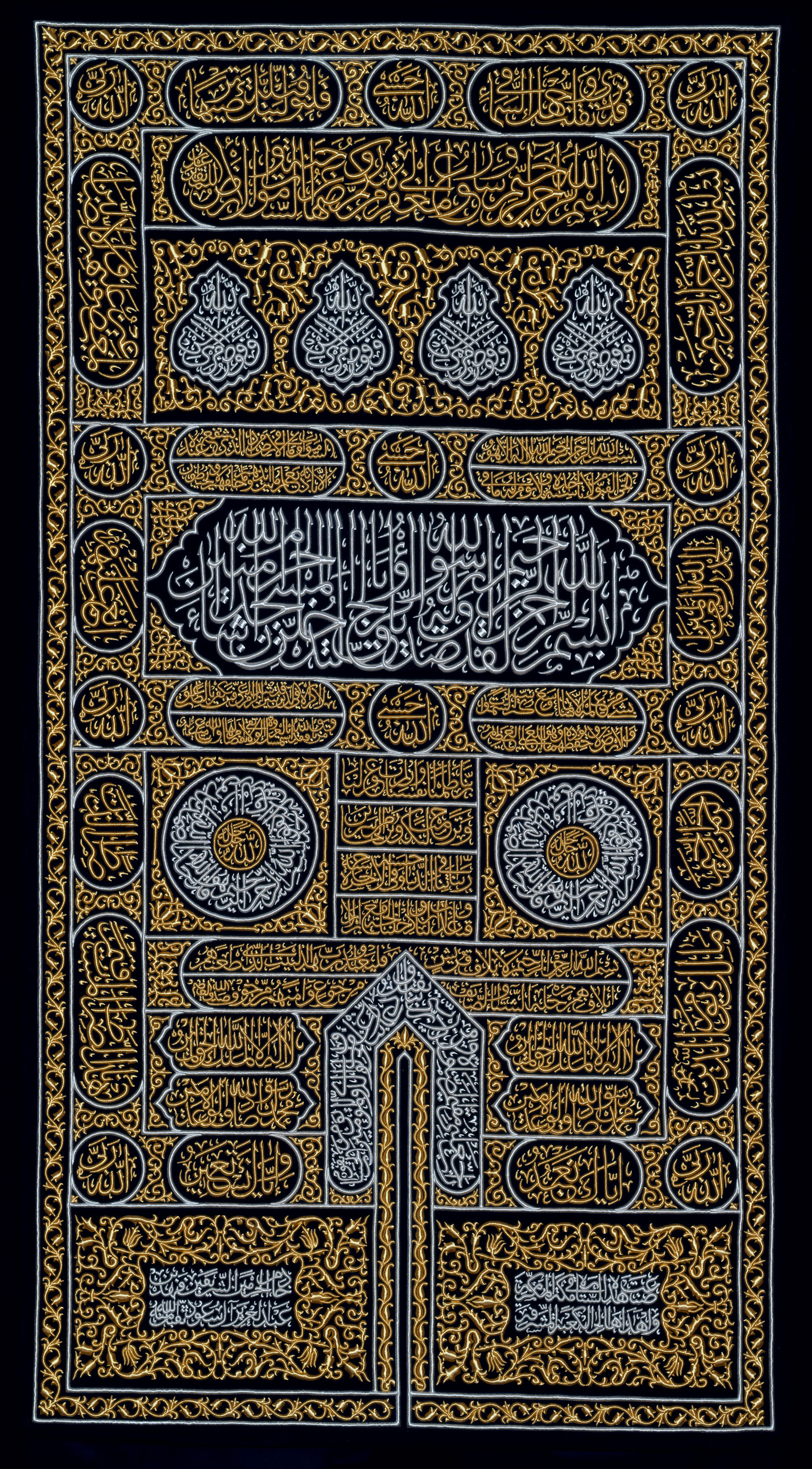 The kiswah and its asociated textiles have been woven and embroidered in Mecca since 1962. The design of the curtain for the door of the Ka‘bah, of which this is an example, generally followed those that had been made in Egypt since 1909, although the choice of Qur’anic verses and their placement on the curtain differed.