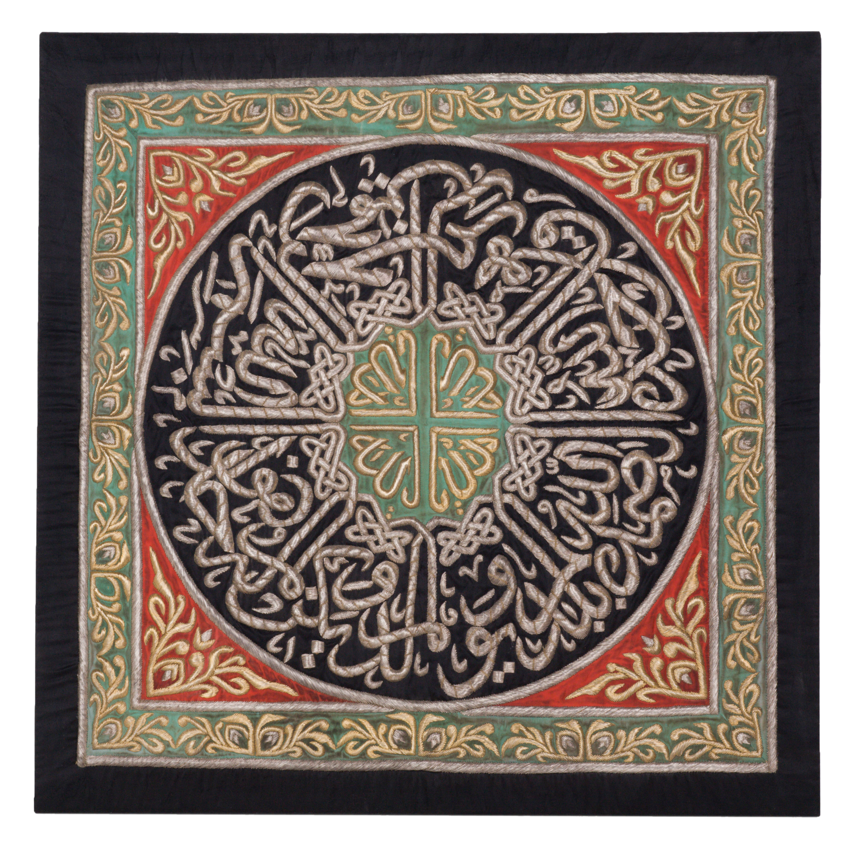 The panel, known as a kardashiyyah, is inscribed with surah al-Ikhlas (CXII), verses 1–4, around the invocation, ya Allah, repeated and mirrored in the centre. Four such panels were sent by Egypt every year. They were attached to the kiswah of the Ka‘bah, one for each corner of the building and positioned just below the belt or hizam. Similar square panels with circular inscriptions were also incorporated within the design of the belt itself.