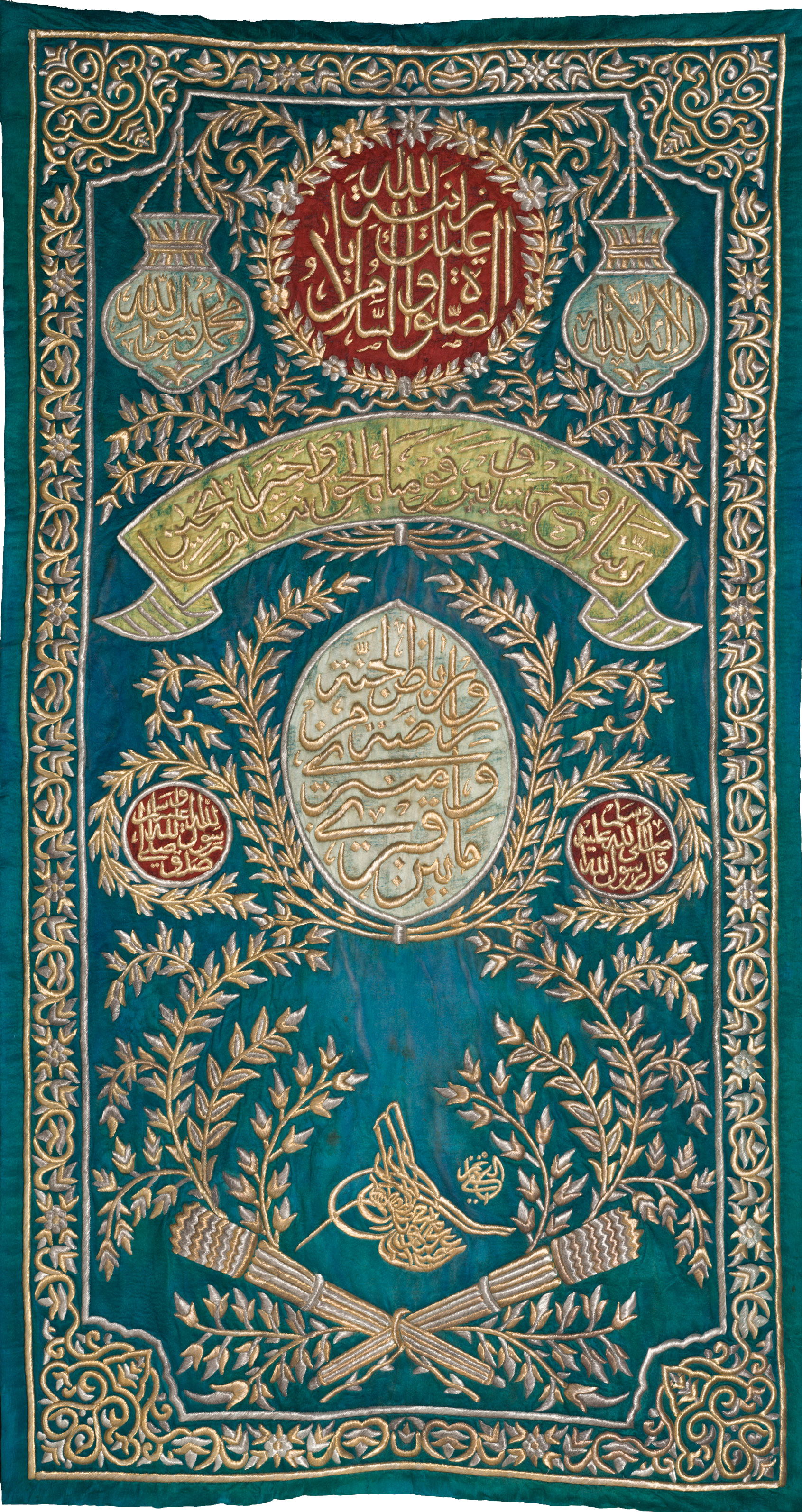 The large red medallion at the top of the curtain is inscribed with a prayer upon the Prophet. The two lamps to either side of it carry the shahadah. Below these, on green ground, is Qur’an,surah al-A‘raf, VII, verse 89, in part and, in the pale blue oval, the hadith, ma bayna qabri wa minbari rawdah min riyad al-jannah (‘Between my tomb and my minbar is one of the gardens of Paradise’).