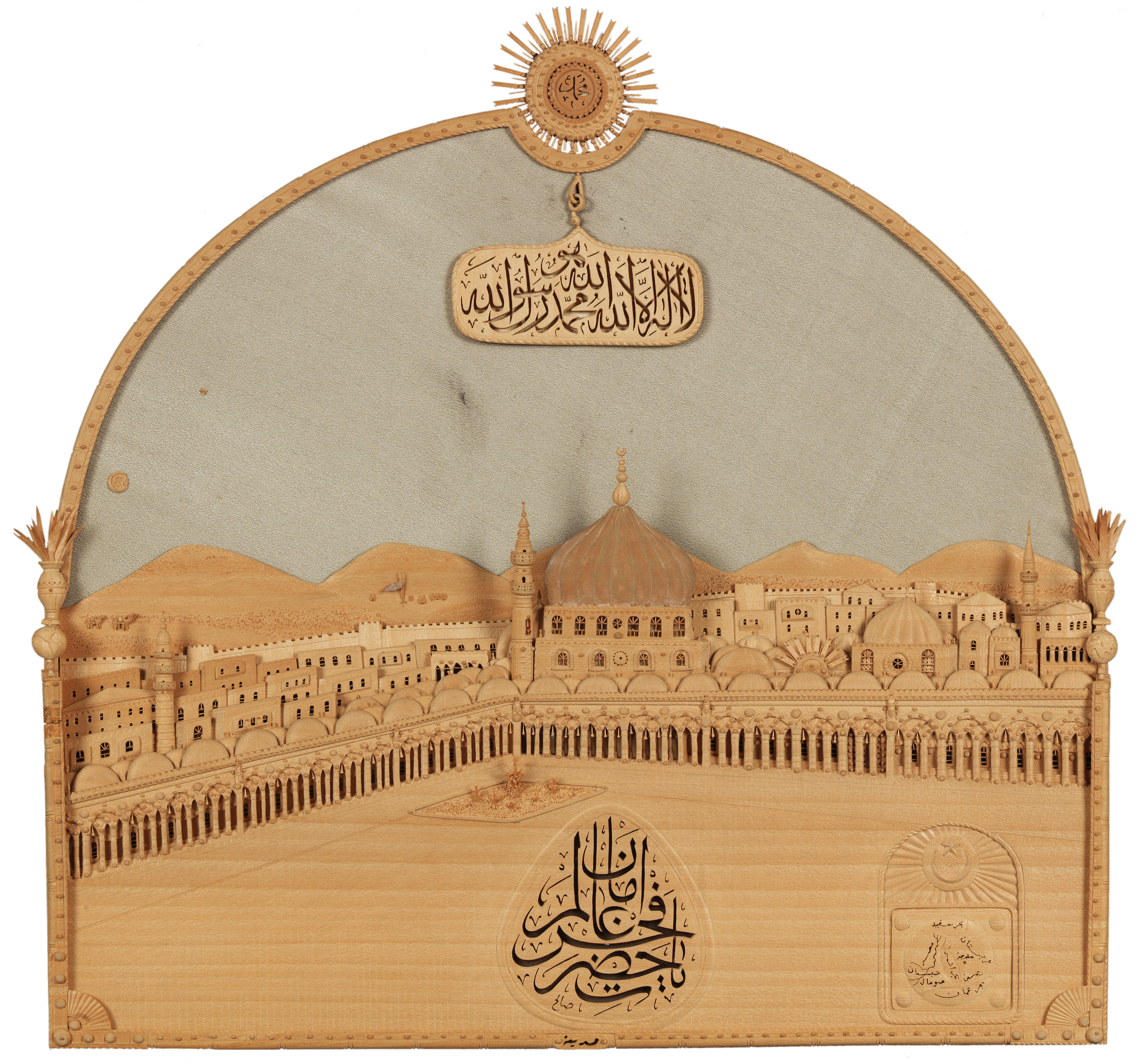 This view of the Prophet’s mosque is intricately carved in wood and dates from the early 20th century. The wood is likely linden wood, which is soft, lightly grained and easily worked, so it is ideal for elaborate carving. The background is made of a light-coloured satin.
