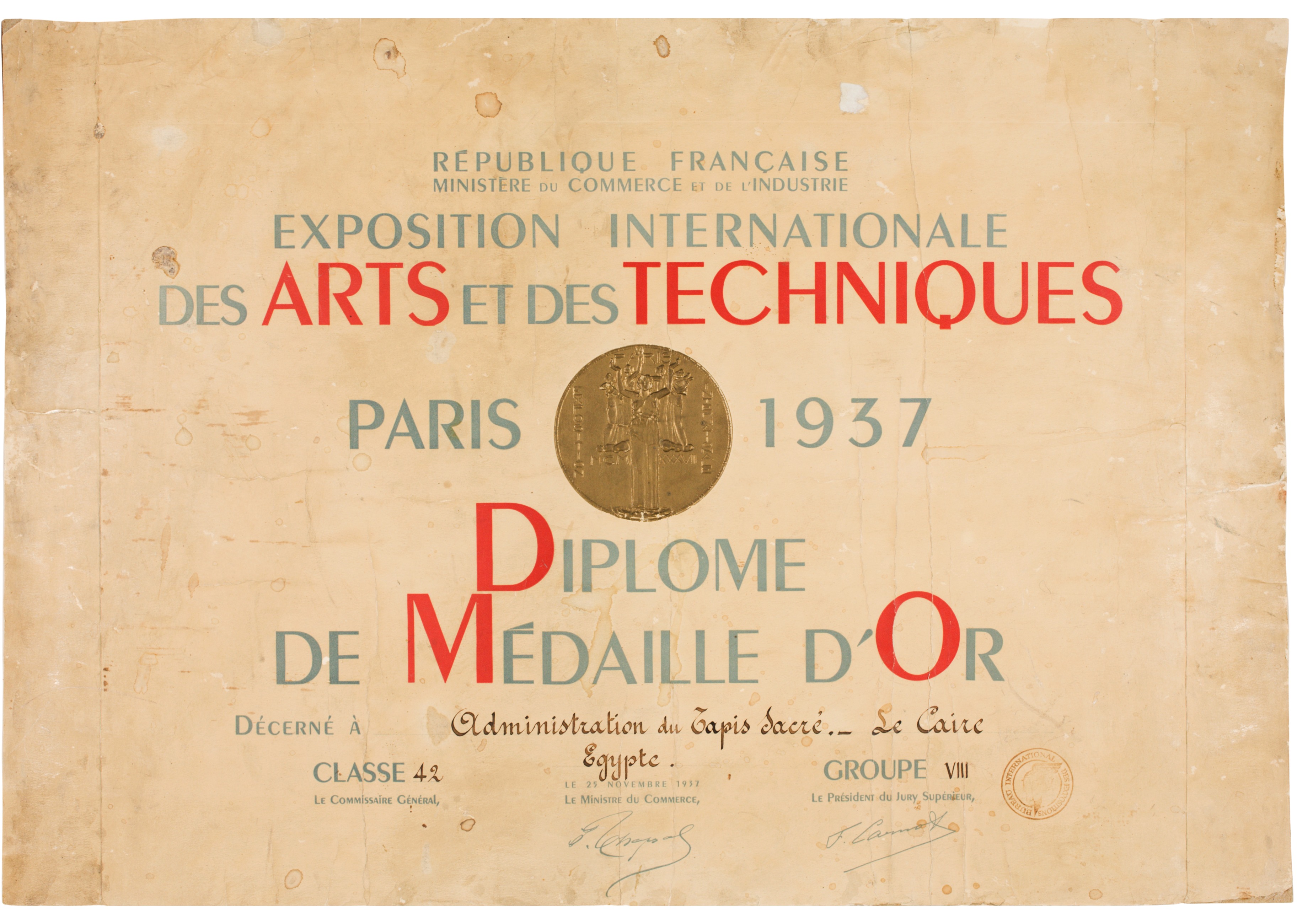 Diploma for a Gold Medal awarded to the ‘Administration du Tapis Sacré. – Le Caire. Egypte.’ at the Exposition Internationale des Arts et des Techniques, Paris, 1937. Classe 42. Groupe VIII. 25 November 1937.
