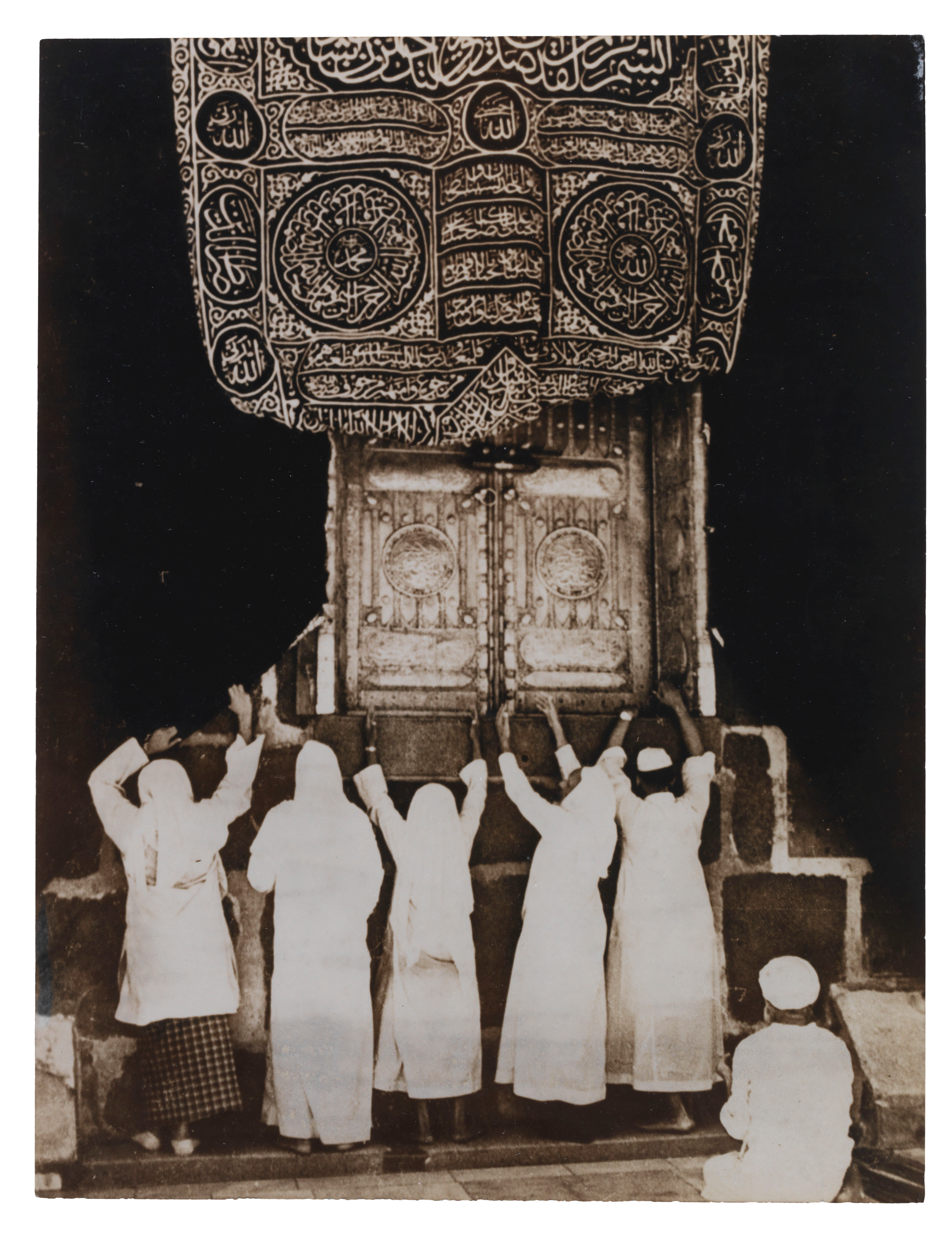 This photograph shows pilgrims at the multazam, which is the area between the black stone and the door of the Ka‘bah. The door of the Ka‘bah is at a height of approximately 2m above ground level.